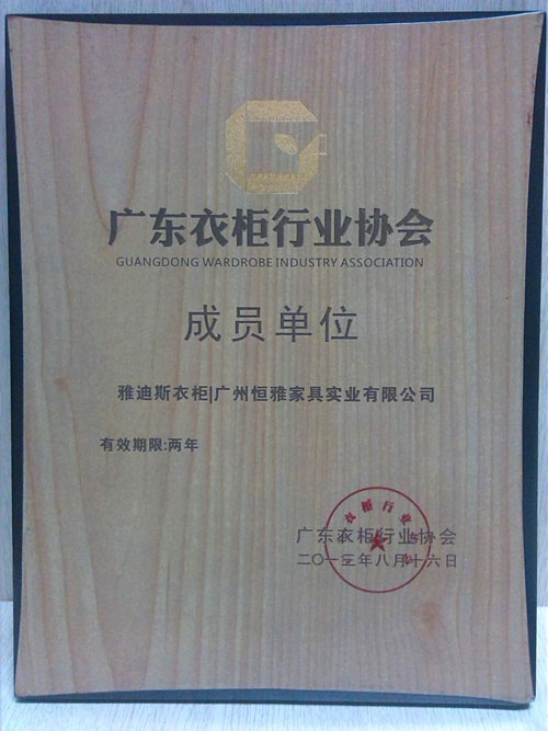 ATIS雅迪斯榮獲“廣東衣柜行業(yè)協(xié)會成員單位”-牌匾