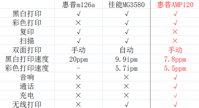 我拿另外兩臺(tái)打印機(jī)對(duì)比,做了一個(gè)比較直觀的表格,通過(guò)這類(lèi)表格,大家自己就可以很容易地選出適合自家的打印機(jī)。