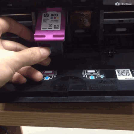 按照蓋上指示的位置,在對(duì)應(yīng)的卡槽放入對(duì)應(yīng)的墨盒然后扣上,聽(tīng)到“卡”地一聲墨盒與卡槽相扣的聲音即可。