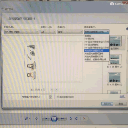 在電腦上按A4紙對(duì)圖片進(jìn)行排版,選擇紙質(zhì)類(lèi)型“其他光面噴墨打印紙”,點(diǎn)擊打印。