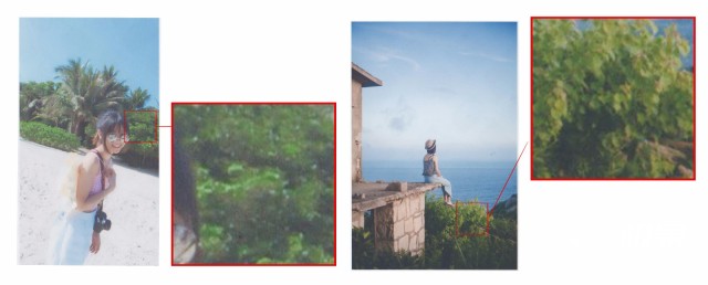 上圖是不同畫(huà)質(zhì)的圖片,截取同樣大小紅框位置放大同樣倍數(shù)后看到的圖像,左圖一片糊,右圖還是能清楚地看見(jiàn)葉子的形狀。左邊原圖是用帶有美顏功能的app拍的,手機(jī)上放大看本身就有一些糊,像這類(lèi)照片建議就不要打印了,打出來(lái)的感覺(jué)像是早年那種低像素手機(jī)自拍照的感覺(jué)。