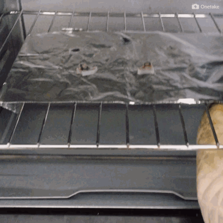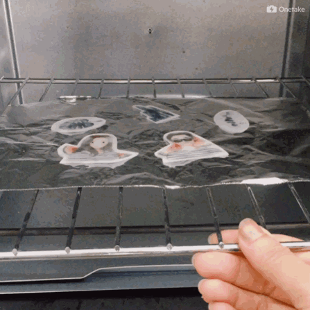 將剪好的熱縮片光滑面朝下,放入預(yù)熱到160°左右的烤箱中,加熱約10分鐘。