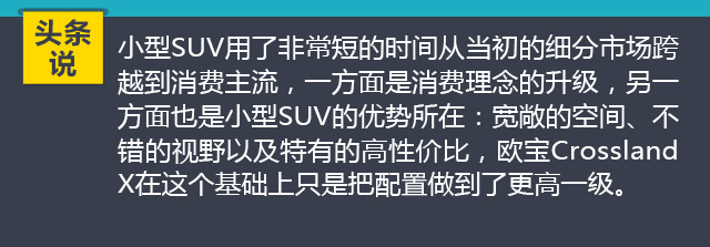 第一眼看到Crossland X的外觀大多數(shù)消費(fèi)者很容易把它與現(xiàn)款的別克昂克拉放在一起,的確二者之間有著太多的淵源了。不過(guò)細(xì)看Crossland X,能夠找出更多的時(shí)尚元素,比較花心思設(shè)計(jì)的進(jìn)氣格柵、被亮條修飾的雙色車(chē)頂這都是Crossland X的亮點(diǎn)所在。