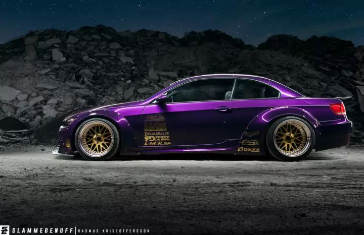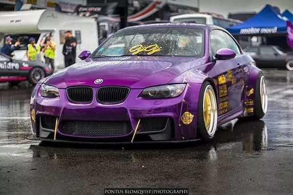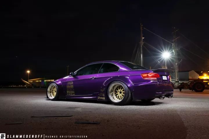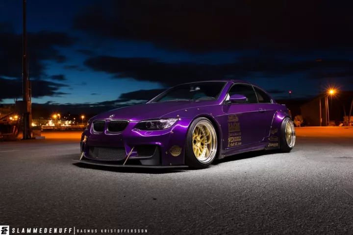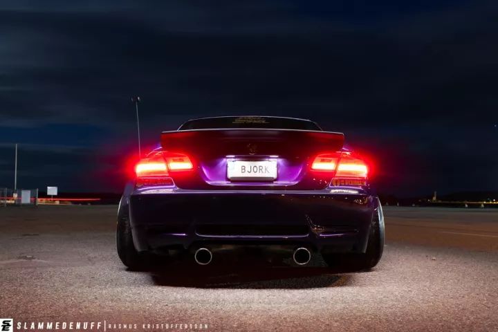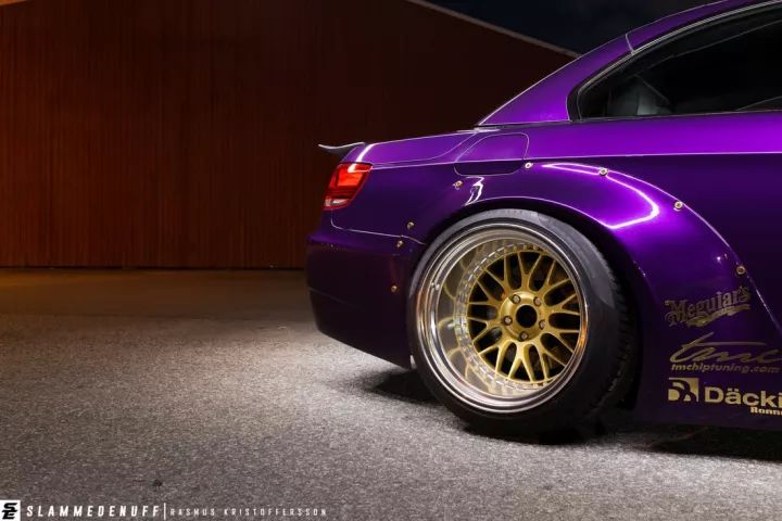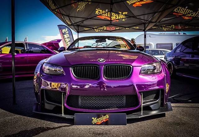 這輛335i重新噴上了一層騷氣的紫色,在有光線的地方特別亮眼。與不少車主改裝會換M3包圍不一樣,車主給它換上了一套1M前包圍,竟沒有違和的感覺,同時還定制了一塊大前鏟,很有競技的味道。