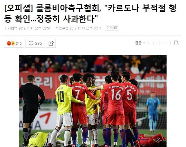 事情發(fā)生后,今天上午,韓國足協(xié)公布了哥倫比亞足協(xié)發(fā)來的道歉公文,哥倫比亞足協(xié)秘書長拉蒙-海倫在公文中寫到:非常感謝韓國方面接受哥倫比亞代表隊的訪問,但是,在昨天進行的友誼賽中,球員卡爾多納對韓國選手做出了不恰當(dāng)?shù)呐e動。在此向韓國代表隊和韓國國民鄭重道歉,我們努力保證這樣的事情不再發(fā)生。祝賀韓國隊取得比賽的勝利,希望韓國隊在明年的俄羅斯世界杯上取得好成績。