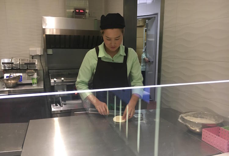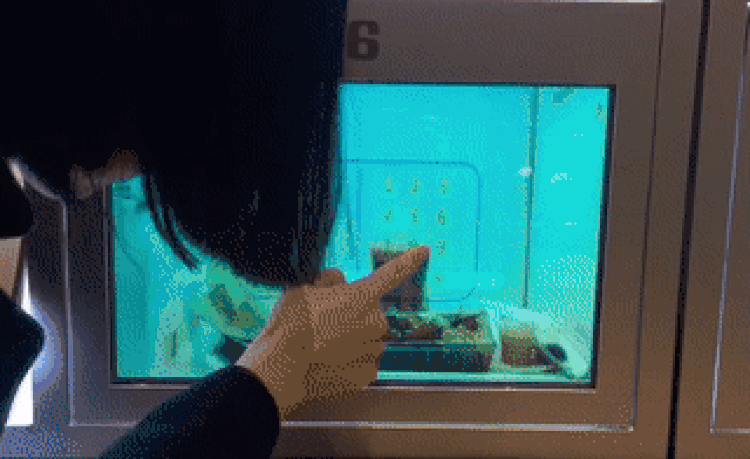 比較有科技感的透明屏取代了傳統(tǒng)的收銀、取餐柜臺(tái),為了讓“無(wú)人店”的感覺(jué)更逼真,店員在后方放置餐點(diǎn)時(shí),屏幕會(huì)變成不透視的黑色,然后再恢復(fù)到可以輸入密碼的鍵盤(pán)模式。