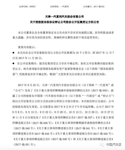 11月6日晚,一汽夏利發(fā)布公告,提出公司接到《關(guān)于一汽股份以公開征集受讓方的方式轉(zhuǎn)讓部分一汽夏利股份的函》,該函稱一汽股份收到國務(wù)院國資委電話通知,國務(wù)院國資委同意一汽股份通過公開征集受讓方的方式協(xié)議轉(zhuǎn)讓所持公司394537587股股份,占公司總股本的24.73%。
