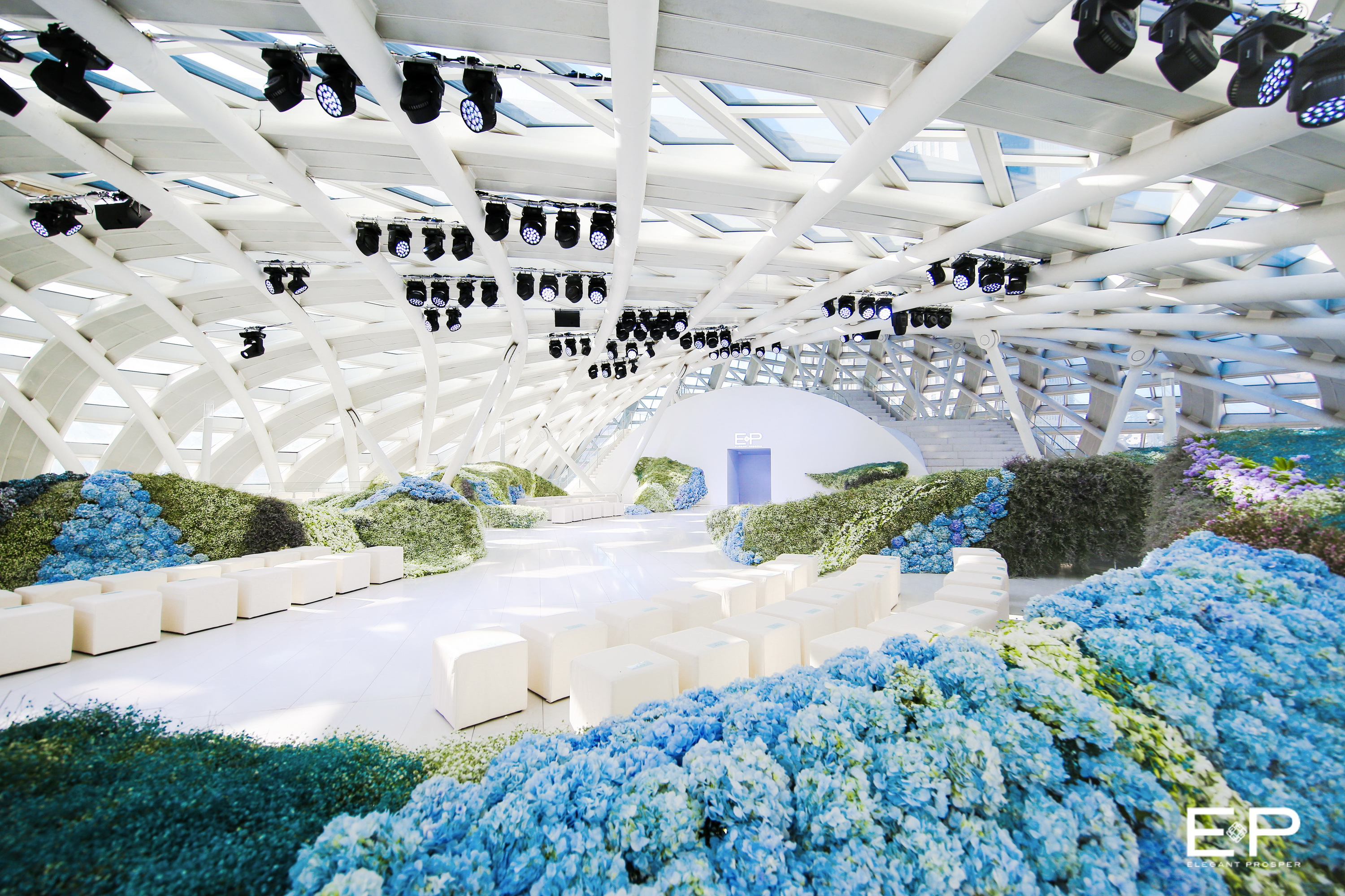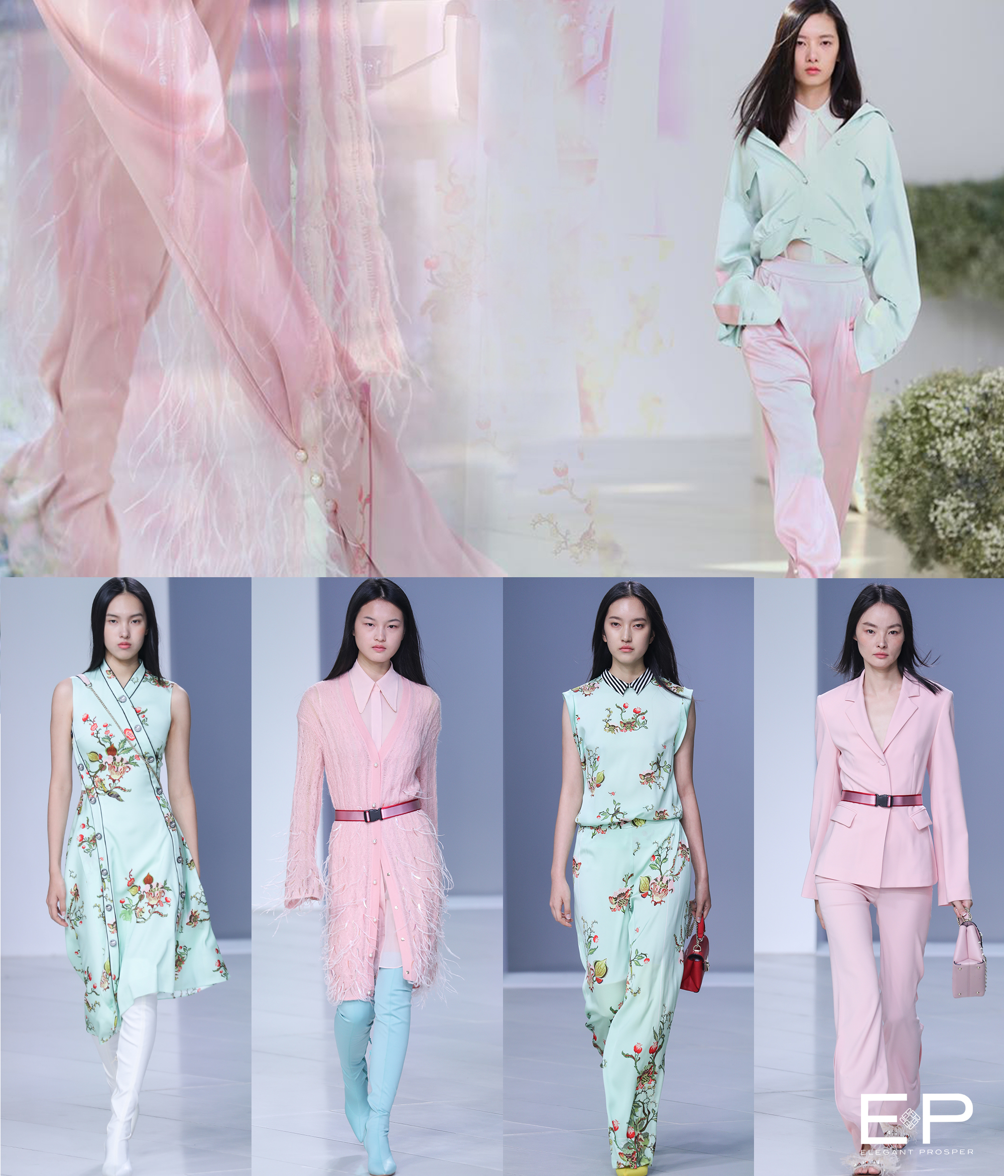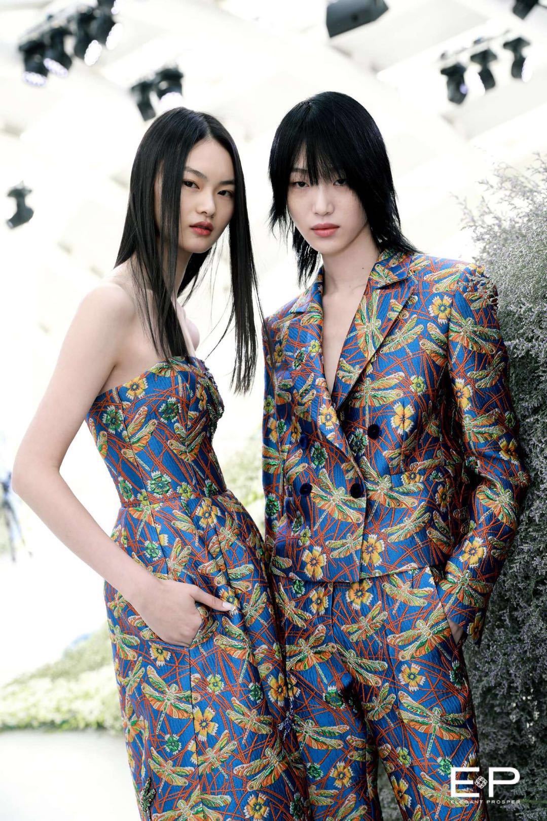 大秀以“灃薗”為主題,依循心中美好綺麗的愿望,雕砌品牌心中的繁茂花園。“灃”意為水之豐,水之盛;“薗”為園林,為造景。EP雅瑩提取自然之靈,采擷無(wú)數(shù)繁花的盛夏之藍(lán), 與江南一方溫潤(rùn)水土的文化底蘊(yùn)相融,新解摩登東方美韻。