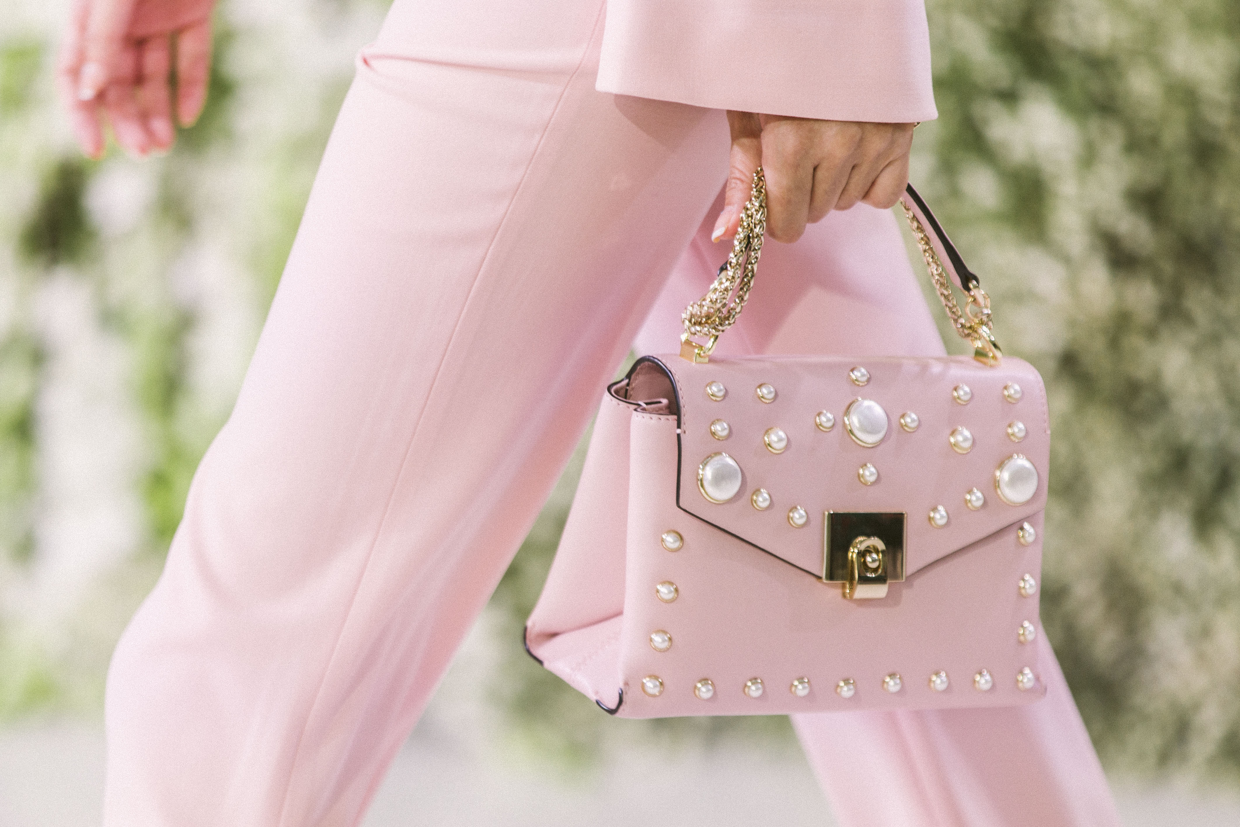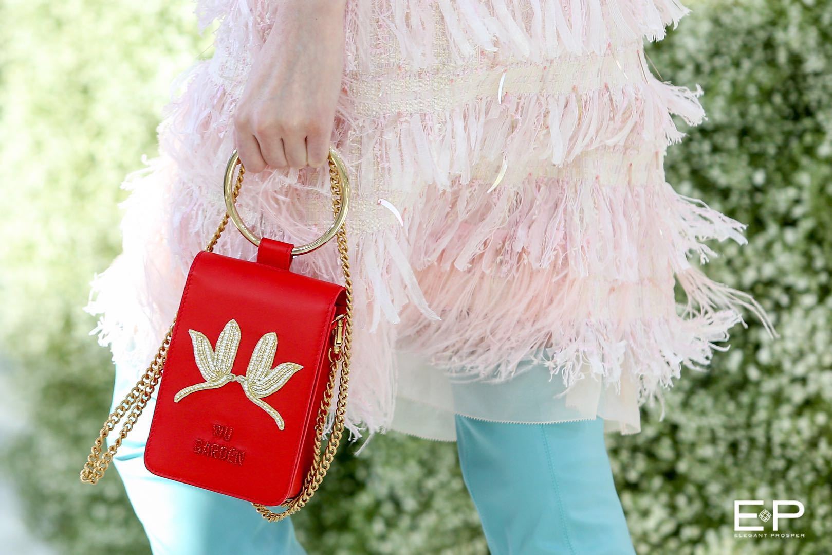 配飾的創(chuàng)意也同樣獨(dú)具匠心,靈感于東方園林拱門的手提圓環(huán)mini size斜挎包,綴以溫潤(rùn)珍珠、刺繡蜻蜓、花卉的手提包,色調(diào)鮮亮的尖頭針織靴、羽毛平底拖鞋,于設(shè)計(jì)巧思中,將趣味與摩登感盡顯。