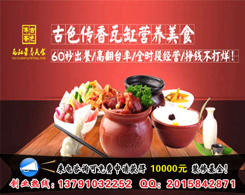 ?a古色傳香瓦罐中式快餐加盟需要多少錢1項目推出以來,瓦罐快餐加盟在近10年的時間里扶持了600多家成功店面,先一步加盟,快一步成功,瓦罐快餐加盟“以快制勝,以為稱霸”來占領市場的高地,600個成功經(jīng)驗教你開店。古色傳香瓦罐中式快餐加盟需要多少錢 ??為什么能扶持600多家成功店面瓦罐快餐加盟優(yōu)勢: ??1、無明火,無噪音,無油煙:瓦罐快餐加盟制作過程無明火、無噪音、無油煙,顧客不受打擾的同時更加環(huán)保! ??2、無灶臺,無廚師,無廚房:瓦罐快餐加盟的經(jīng)營者經(jīng)過總部培訓即將上崗,做菜全靠2個瓦缸,節(jié)約時間兩全其美a古色傳香瓦罐中式快餐加盟需要多少錢1 ??3、上手快,好管理,易操作:瓦罐快餐加盟統(tǒng)一標準、配方、流水線操作,核心技術易學易懂,入門快,手把手教學讓你成為美食主導者! ??4、保營養(yǎng),抓健康,促養(yǎng)生:瓦罐快餐加盟經(jīng)中醫(yī)秘制研制,根據(jù)國人的體質,配出22種滋補中藥材,構成養(yǎng)生配方,讓你越吃越健康a古色傳香瓦罐中式快餐加盟需要多少錢1 ??5、菜品多,多樣化,:瓦罐快餐加盟菜品多樣化:瓦罐煨湯、瓦罐煨菜、瓦缸燒烤、鹵肉大全等等不分四季,顧客生生不息a古色傳香瓦罐中式快餐加盟需要多少錢1 ??古色傳香瓦罐快餐更具養(yǎng)生價值:現(xiàn)在的消費者非常看重事物的營養(yǎng)價值,如果食物沒有更好的營養(yǎng)價值,那大家的興趣就不會太高。瓦罐快餐總部擁有專業(yè)的研發(fā)團隊,定期更新產(chǎn)品。新品菜肴經(jīng)直營店推行成功后,將推廣到各合作店。煲仔飯中有多道菜肴采用山林中的原生態(tài)材料,帶來無可比擬的清新口感和養(yǎng)生功效。古色傳香瓦罐中式快餐加盟需要多少錢