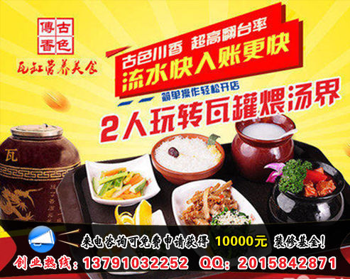 ?a古色傳香瓦罐小吃加盟費多少錢1項目推出以來,瓦罐快餐加盟在近10年的時間里扶持了600多家成功店面,先一步加盟,快一步成功,瓦罐快餐加盟“以快制勝,以為稱霸”來占領(lǐng)市場的高地,600個成功經(jīng)驗教你開店。古色傳香瓦罐小吃加盟費多少錢 ??為什么能扶持600多家成功店面瓦罐快餐加盟優(yōu)勢: ??1、無明火,無噪音,無油煙:瓦罐快餐加盟制作過程無明火、無噪音、無油煙,顧客不受打擾的同時更加環(huán)保! ??2、無灶臺,無廚師,無廚房:瓦罐快餐加盟的經(jīng)營者經(jīng)過總部培訓即將上崗,做菜全靠2個瓦缸,節(jié)約時間兩全其美a古色傳香瓦罐小吃加盟費多少錢1 ??3、上手快,好管理,易操作:瓦罐快餐加盟統(tǒng)一標準、配方、流水線操作,核心技術(shù)易學易懂,入門快,手把手教學讓你成為美食主導者! ??4、保營養(yǎng),抓健康,促養(yǎng)生:瓦罐快餐加盟經(jīng)中醫(yī)秘制研制,根據(jù)國人的體質(zhì),配出22種滋補中藥材,構(gòu)成養(yǎng)生配方,讓你越吃越健康a古色傳香瓦罐小吃加盟費多少錢1 ??5、菜品多,多樣化,:瓦罐快餐加盟菜品多樣化:瓦罐煨湯、瓦罐煨菜、瓦缸燒烤、鹵肉大全等等不分四季,顧客生生不息a古色傳香瓦罐小吃加盟費多少錢1 ??古色傳香瓦罐快餐更具養(yǎng)生價值:現(xiàn)在的消費者非常看重事物的營養(yǎng)價值,如果食物沒有更好的營養(yǎng)價值,那大家的興趣就不會太高。瓦罐快餐總部擁有專業(yè)的研發(fā)團隊,定期更新產(chǎn)品。新品菜肴經(jīng)直營店推行成功后,將推廣到各合作店。煲仔飯中有多道菜肴采用山林中的原生態(tài)材料,帶來無可比擬的清新口感和養(yǎng)生功效。古色傳香瓦罐小吃加盟費多少錢
