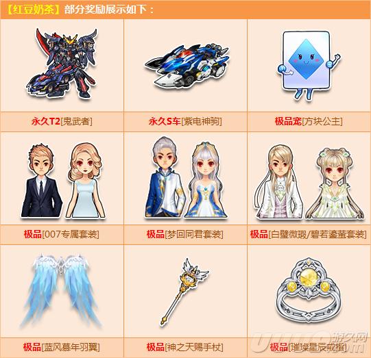 11月3日-12月13日期間,購(gòu)【紅豆奶茶】,必得角色經(jīng)驗(yàn)卡+900,且有6.2%-7.6%的幾率獲得永久T2【鬼武者】,永久S車【紫電神駒】、極品寵【方塊公主】、極品【007專屬套裝】/【夢(mèng)回同君套裝】/【白璧微瑕/碧若鎏螢套裝】或其他獎(jiǎng)勵(lì)之一!