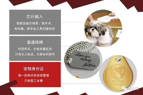 目前市面上有三類寵物吊牌:一是植入式芯片,終身受用但價格高,服務網點少,需要使用專業(yè)工具才能查詢寵物主人信息,切入市場不深;二是智能化項圈,能夠記錄寵物的多項數據,但費用高昂,易磨損,容易存在電池沒電等情況,不是剛需產品也無法普及市場;三是淘寶上的普通寵物銘牌,便宜耐磨且實用。