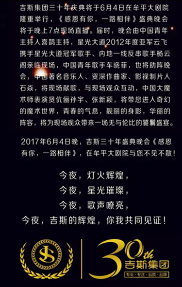 \u00A0 \u00A0 大眾網(wǎng)煙臺(tái)6月4日訊(通訊員 王肖妹\u00A0記者 于飛)6月4日,煙臺(tái)吉斯家具集團(tuán)有限公司在牟平大劇院隆重舉行“跨越三十載,再譜新詩篇”30年慶典,中國家具協(xié)會(huì)秘書長(zhǎng)張冰冰女士、山東省家具協(xié)會(huì)執(zhí)行會(huì)長(zhǎng)牛廣霞女士、牟平區(qū)統(tǒng)戰(zhàn)部部長(zhǎng)林福云先生、牟平區(qū)副區(qū)長(zhǎng)李劍先生、牟平區(qū)區(qū)聯(lián)社主任徐愫成先生蒞臨盛會(huì),與來自全國各地的1000多名經(jīng)銷商共同見證這一輝煌時(shí)刻。