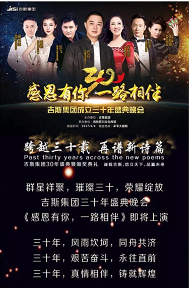 \u00A0 \u00A0 4日晚上,吉斯集團(tuán)30年“感恩有你,一路相伴”盛典晚會(huì)將在牟平大劇院舉行,吉斯集團(tuán)董事長(zhǎng)孫杰先生將在盛典晚會(huì)上代表吉斯集團(tuán)向山東省普覺公益基金會(huì)吉祥如斯公益基金捐助愛心款10萬元,并在晚會(huì)上為“功勛員工”頒發(fā)功勛獎(jiǎng)。