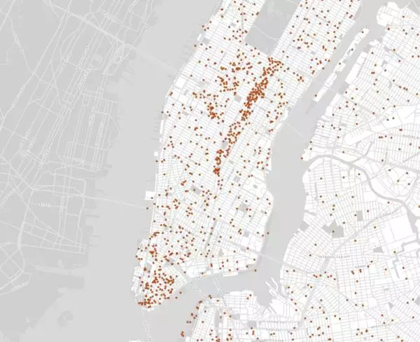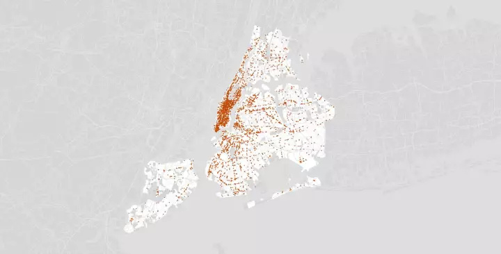 下面這張地圖展示了紐約城所有3389家咖啡店的分布(排除餐館、超市和其他可能售賣咖啡的商鋪)。