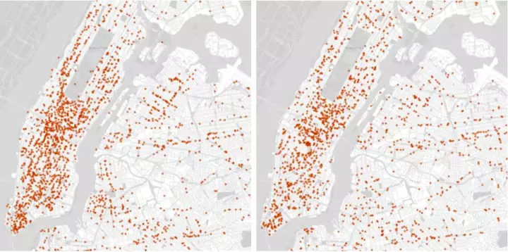 完善了這一點后,我們的模型就立刻發(fā)現(xiàn),咖啡店在曼哈頓中城和下城顯示出了明顯密集的集中趨勢,修正后的地圖也與實際的情況更加相近。