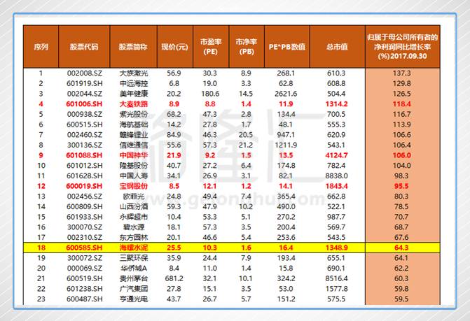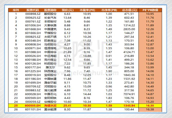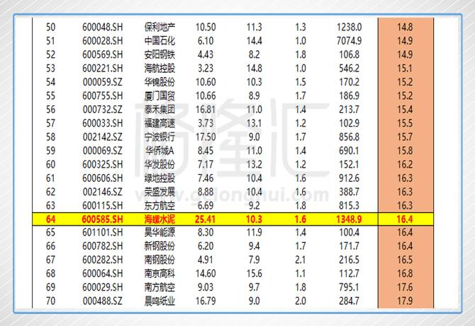 全市場按條件篩選出來的1157只中符合PE*PB數(shù)值低于22.5的數(shù)量僅有107只,符合格老低估標(biāo)準(zhǔn)的僅占10%,實(shí)屬嚴(yán)格。而排在64位的海螺水泥屬于前5%的低估,足以說明其在市場的低估位置的分量。