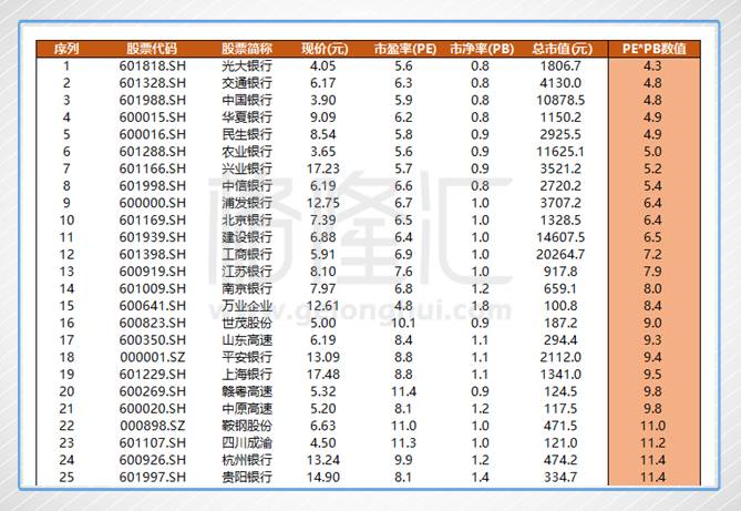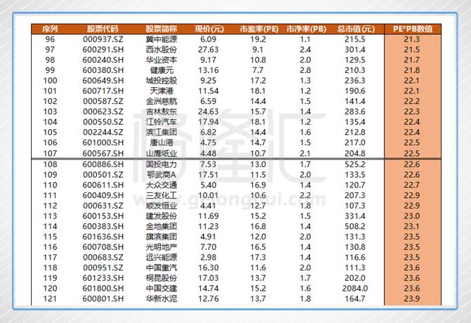 若把初選條件放寬至PE>0,PB>0,全市值大于100億等三個(gè)條件在A股市場篩選了1157只股票,使用PE*PB數(shù)值排序如下:
