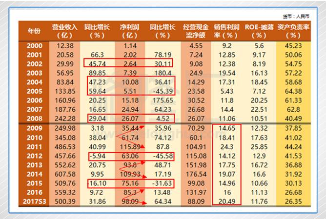 (1)2000年-2008年,前9年,有5年的數(shù)據(jù)是營收增速大于利潤增速的,增收不增利,證明行業(yè)競爭激烈或海螺正處于業(yè)務(wù)競爭擴(kuò)張的時(shí)期;而每三年左右就會(huì)出現(xiàn)一年比較不利的環(huán)境,凈利率下降明顯。這個(gè)波動(dòng)的規(guī)律一直在2009年-2016年間也成立;