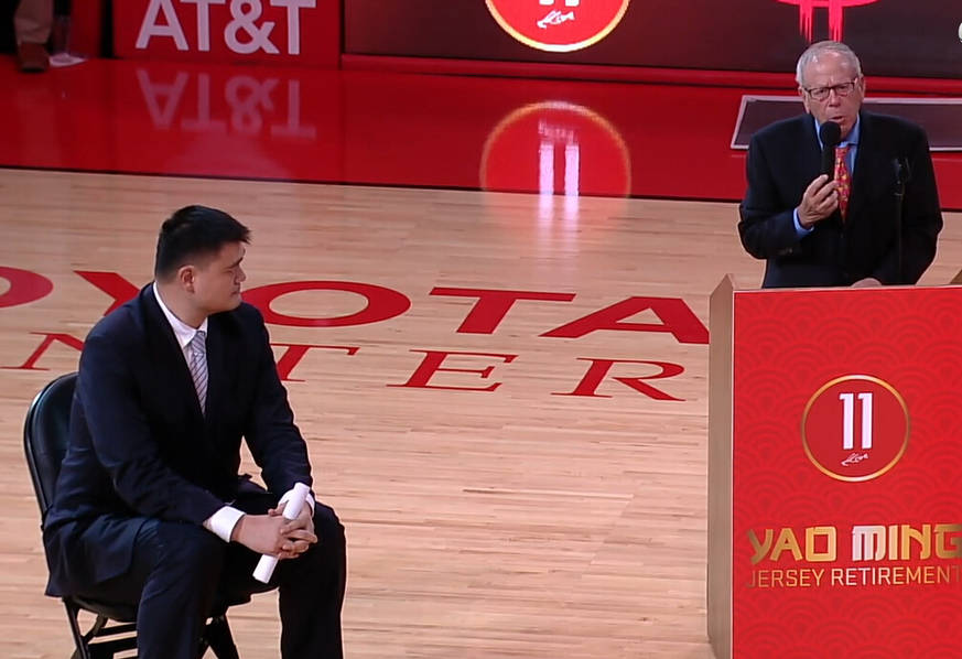 火箭主場(chǎng)迎戰(zhàn)公牛,在中場(chǎng)休息期間,火箭為姚明舉辦了球衣退役儀式,大姚的11號(hào)戰(zhàn)袍在火箭封存。作為在NBA最成功的中國(guó)球員,姚明用他的天賦和努力,成就了屬于自己,屬于籃球的傳奇。