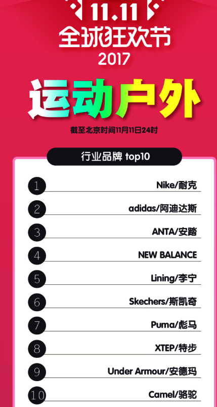 然而,在運動戶外領(lǐng)域,卻是有喜有悲,截至11月12日零點,銷售前五的品牌依次是耐克、阿迪、安踏、新百倫、李寧。其中安踏(02020.HK)的上升趨勢明顯,去年的這個榜單上,安踏排在第五;另外一個民族品牌——李寧(02331.HK)則在激烈的競爭面前下滑了一位。