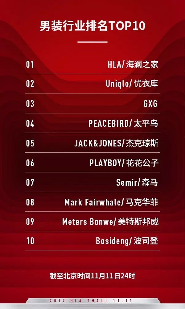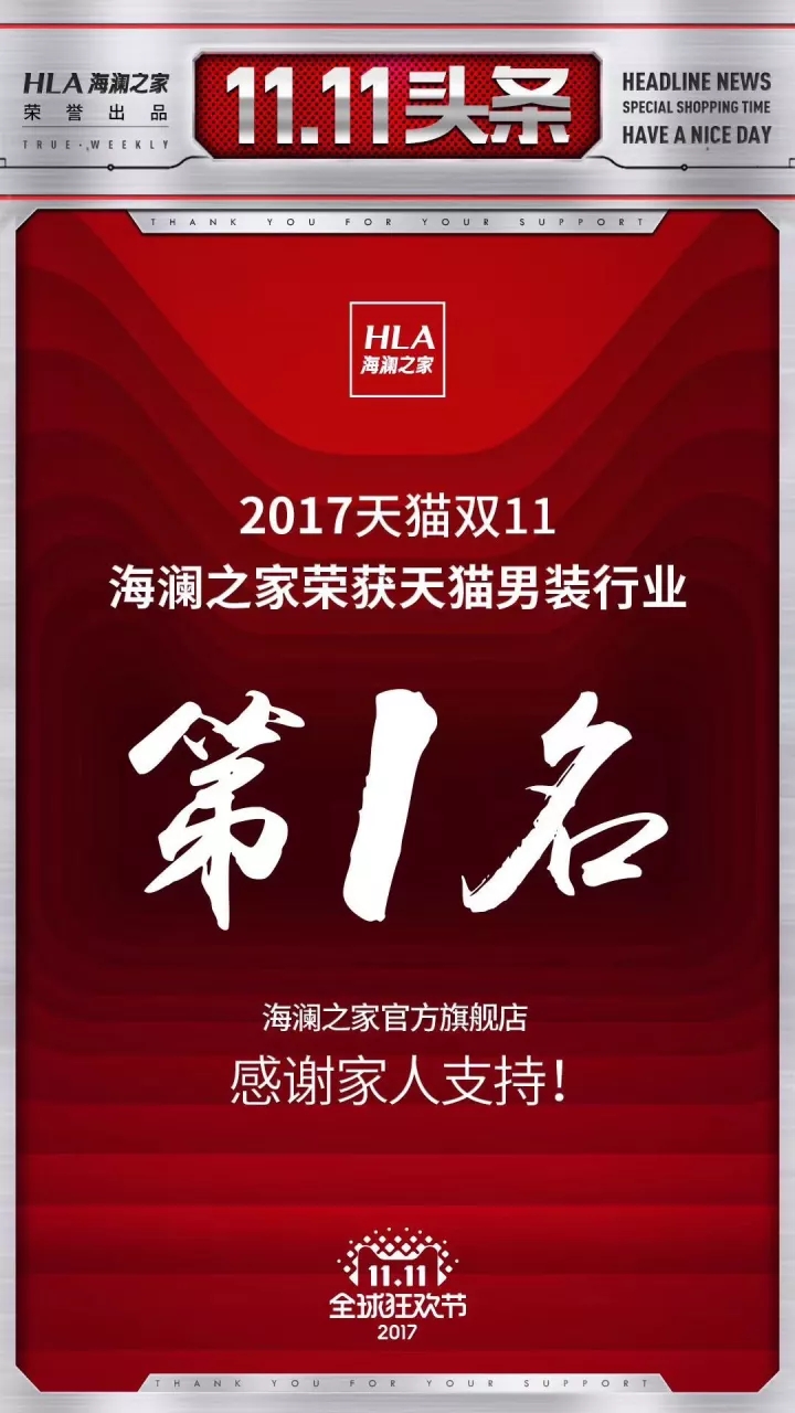 2017年11月11日,歷經(jīng)1440分鐘的緊張鏖戰(zhàn),男裝國民品牌海瀾之家以407,750,017元的成交額,最終成功拿下2017雙11天貓男裝行業(yè)第一名!