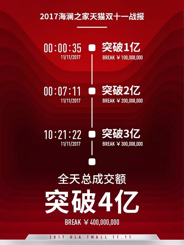 積聚已久的能量從凌晨開始爆發(fā)。11日0時35秒,海瀾之家率先破億,領銜中國品牌成為2017首批“天貓雙11億元俱樂部”成員。此后捷報頻傳,最終海瀾之家雙11全天成交額猛破4億!
