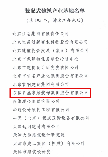 據住房和城鄉(xiāng)建設部辦公廳文件《住房城鄉(xiāng)建設部辦公廳關于認定第一批裝配式建筑示范城市和產業(yè)基地的函》,北京、上海、深圳、杭州等30個城市成為裝配式建筑示范城市,東易日盛與北京住總集團、上海城建集團、萬科企業(yè)等195個企業(yè)成為首批裝配式建筑產業(yè)基地。