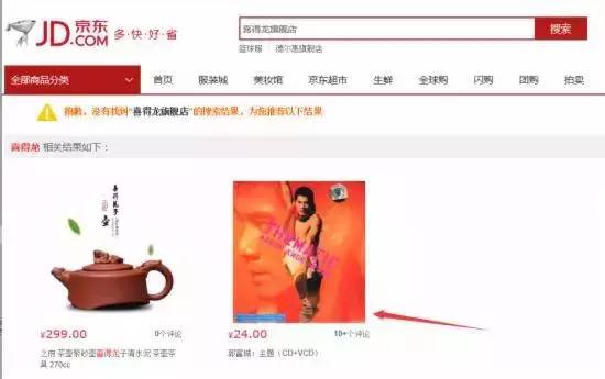 在京東首頁搜索框輸入“喜得龍旗艦店”,出現(xiàn)了郭富城的CD,里面有其為喜得龍代言的廣告歌《I Am Aaron Kwok》。