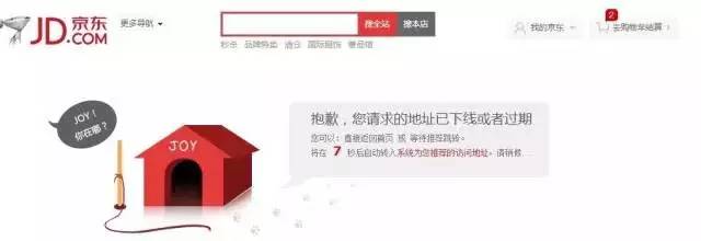 在喜得龍官網(wǎng)首頁右上角,依然掛著“天貓旗艦店”的入口提示,但是點擊進(jìn)去之后,卻跳轉(zhuǎn)到了京東頁面,并提示“抱歉,您請求的地址已下線或者過期”。