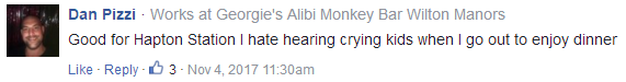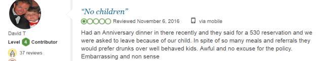 “最近的結(jié)婚周年紀(jì)念在那里吃飯,他們說接下來有預(yù)定,要求我們離開,原因是因為我們帶著孩子。這個政策真的很糟糕,完全沒理由這么做!”