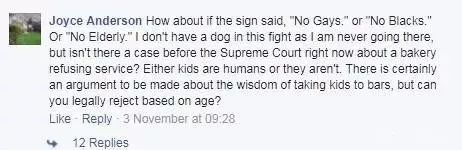 “你們怎么能正大光明地允許歧視呢?這和不允許同性戀入內(nèi)有什么區(qū)別?難以置信!” “下次你們就會因為老年人呆的時間太久把他們趕出去了!道德淪喪!” “你們這次是不許小孩子進(jìn)來,下次又不讓誰進(jìn)呢?黑人?猶太人?土著人?真可恥!”