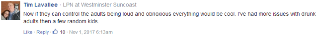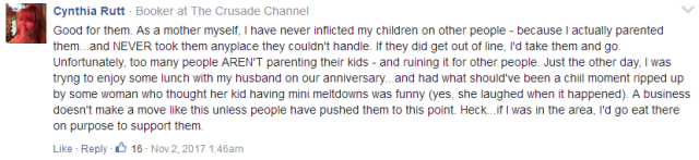 “我真的要問問:你們餐廳去禁止大聲喝酒的顧客嗎?有禁止那些大聲打電話和說話的討厭大人嗎?” “不讓我家孩子去,我也不會再去了!”