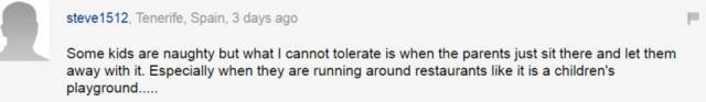 “有些小孩很調(diào)皮,但我不能容忍的是他們的父母居然放任他們。特別是他們在餐廳里追逐,就好像在兒童樂園一樣”
