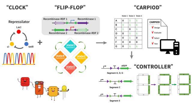 今年北大iGEM團(tuán)隊(duì)利用合成生物學(xué)手段,提出了一套在細(xì)菌內(nèi)搭建遺傳時(shí)序邏輯線路,使細(xì)菌能夠自動(dòng)按順序執(zhí)行對應(yīng)功能的設(shè)計(jì)框架。充分借鑒數(shù)字理論中時(shí)序邏輯的概念,他們在生物系統(tǒng)內(nèi),對應(yīng)設(shè)計(jì)了其三個(gè)基本組成部分——時(shí)鐘(Clock),分頻器(Frequency Divider),解釋器(Interpreter)。其中,時(shí)鐘的實(shí)現(xiàn)利用了合成生物學(xué)經(jīng)典工作之一Repressilator,通過周期性產(chǎn)生的輸入信號來協(xié)調(diào)系統(tǒng)工作、驅(qū)動(dòng)細(xì)胞狀態(tài)和功能的自動(dòng)轉(zhuǎn)換;分頻器基于重組酶(Recombinase)和重組酶-RDF(Recombination Directionality Factor)融合蛋白的共同作用,完成了細(xì)胞狀態(tài)的記憶與循環(huán)轉(zhuǎn)換;解釋器利用生物學(xué)基本元件(啟動(dòng)子、終止子等)與重組酶作用位點(diǎn)的特定設(shè)計(jì),將細(xì)胞的狀態(tài)轉(zhuǎn)化為特定功能。通過實(shí)驗(yàn)以及理論分析,北大iGEM證明了該系統(tǒng)的可行性,實(shí)現(xiàn)了利用重組酶來多次改變細(xì)胞的功能。本項(xiàng)目基于合成生物學(xué)對于生命體系的理性設(shè)計(jì)和構(gòu)建,試圖拓展基因線路中“時(shí)間”這一新的維度,探索了人工設(shè)計(jì)細(xì)胞自動(dòng)化執(zhí)行程序的可能性。此外,今年北大iGEM團(tuán)隊(duì)還建立了世界上第一個(gè)合成生物學(xué)維基百科(SynbioWiki.com),它結(jié)合維基百科(Wikipedia)基本的搜索、開放編輯等特征,集中整合合成生物學(xué)針對為全世界合成生物學(xué)工作者以及iGEM參賽選手們提供了一個(gè)集成而精準(zhǔn)的交流平臺。