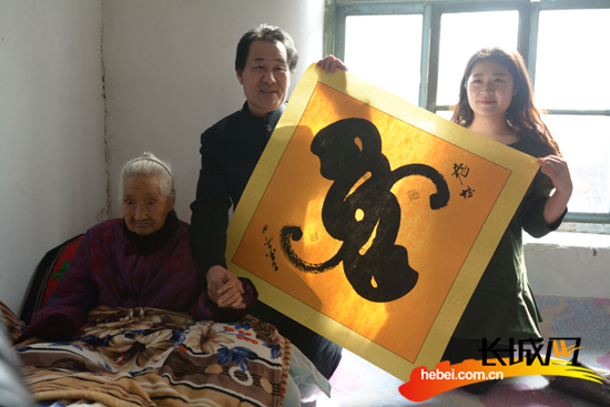 長(zhǎng)城網(wǎng)滄州2月3日訊(記者 張沖 李世文) 1月31日下午,陜西龍城書院院長(zhǎng)許龍城一行10人不遠(yuǎn)千里從陜西西安,來(lái)到河北省河間市詩(shī)經(jīng)村鄉(xiāng)君子館村109歲高齡孟慶銀家中,將寫滿濃濃墨香的“!焙铮偷嚼先思沂种。“老壽星,這是“猴壽”,我特意將這幅作品送給您,希望您健康,長(zhǎng)壽!”陜西龍城書院院長(zhǎng)許龍城緊湊在孟慶銀老太太耳朵旁說(shuō)道。來(lái)這是一個(gè)“喜猴”子,將這個(gè)小猴子送給你家的小猴子24歲的尹曉敏。
