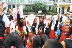 但這并沒有淹沒孩子們的夢想和想象力。一個小女孩說:“我想要一本白雪公主的書!币粋小男孩說:“我想要一個新書包!彼麄冊诋嫾埳习聪235個紅色手印,組成三座火焰山;他們畫下他們心中樹葉的形狀和色彩,構(gòu)成了一棵枝繁葉茂的大樹。他們畫下的小馬、花朵、竹葉和土地,幫助了包括他們自己在內(nèi)的1000多個小孩子。