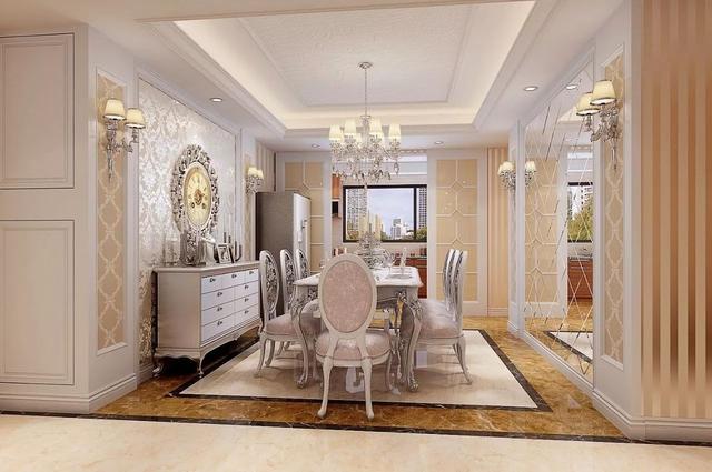 餐廳采用鏡面交錯(cuò)拼接的背景墻裝飾,增強(qiáng)了空間的通透感,使得整體大氣、敞亮。低調(diào)奢華的壁紙搭配典雅精致的居家裝飾,則很好的提升了餐廳空間的檔次,為屋主一家完美的融入高貴氣質(zhì)的用餐氛圍。