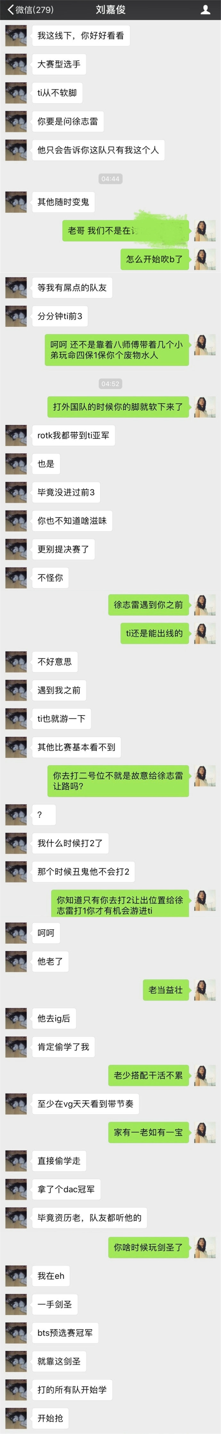 早上五點左右,粉后白晶晶@袖手旁觀咯發(fā)布微博,曬出與眼少的聊天截圖,稱大半夜的本來在討論一些公事,說著說著就變成了劉嘉俊自我吹捧大會,把聊天記錄發(fā)全能把你們笑死。