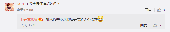 有網(wǎng)友迫切地想要看完整的聊天記錄,粉后在微博評論回復網(wǎng)友說道:聊天內(nèi)容涉及的選手太多了不好發(fā)。