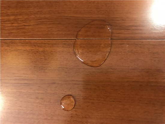 吸水率測(cè)試。據(jù)測(cè)評(píng)人員的了解,柚木的穩(wěn)定性非常高,即使是在日曬雨淋干濕變化較大的情況下也能不翹不裂,常用作游艇甲板。而防水、防潮等性能正是我們?cè)谶x擇木地板時(shí)需要重點(diǎn)考慮的問(wèn)題之一,為測(cè)試安信柚木實(shí)木復(fù)合地板在防水防潮方面的表現(xiàn)力,測(cè)評(píng)人員將水倒在安信柚木實(shí)木復(fù)合地板表面,靜置3分鐘后,發(fā)現(xiàn)水無(wú)擴(kuò)散或者浸透現(xiàn)象,說(shuō)明地板吸水率低,不易變形,具有很好的防潮性。
