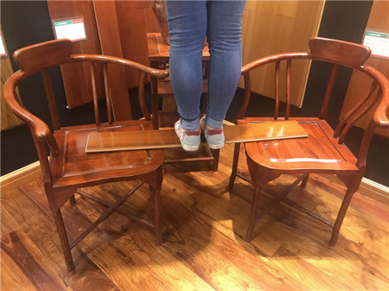 抗壓測(cè)試。地板的高踩踏頻率要求其有很好的抗壓性,在測(cè)評(píng)時(shí),測(cè)評(píng)人員將一塊地板的兩頭分別擱在兩把椅子上,然后請(qǐng)現(xiàn)場(chǎng)一位成年女性站在地板中間,地板無(wú)有明顯彎曲,由此可見安信柚木實(shí)木復(fù)合地板具有良好的抗壓性能。
