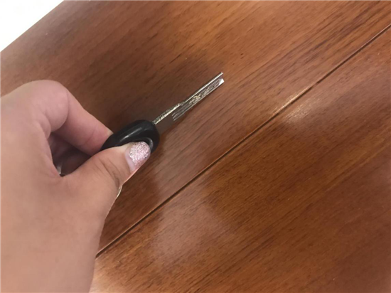 耐磨測(cè)試。地板在使用過(guò)程中還有一個(gè)讓人頭疼的問(wèn)題就是特別容易被刮到、磨到,產(chǎn)生劃痕。為了檢驗(yàn)安信柚木實(shí)木復(fù)合地板的耐磨性能,測(cè)評(píng)人員用鑰匙在地板表面來(lái)回劃,無(wú)明顯劃痕,可見這款安信實(shí)木復(fù)合地板具有很好的耐磨性能。