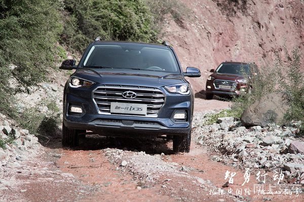 情況了解清楚后,挑戰(zhàn)開始。山腳下路面坡度尚可,穩(wěn)住油門即可順暢通行。新一代ix35的底盤濾振性給我們帶來(lái)很大驚喜,一般承載式車身的SUV在這種碎石路面會(huì)有明顯的顛簸感,而新一代ix35的懸掛系統(tǒng)將很大一部分縱向振動(dòng)吸收化解,而且可以感受到從底盤傳來(lái)的噪音也并不夸張。剛才提到對(duì)于離地間隙的擔(dān)心,駛過(guò)幾段中央凸起的車轍之后我們徹底放心了,看來(lái)新一代ix35不僅具備一副硬朗的外表,對(duì)于通過(guò)能力也進(jìn)行了著重優(yōu)化,20cm左右的地表障礙基本不用擔(dān)心。