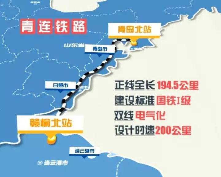 青連鐵路正線全長194.5公里,連接青島市、日照市和連云港市,北起青島北站,終點在贛榆區(qū)與連鹽鐵路相連接,建設標準為國鐵Ⅰ級,雙線電氣化鐵路,設計時速為200公里,客貨并跑。