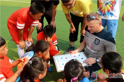 2016年英國(guó)五人制國(guó)家足球隊(duì)隊(duì)長(zhǎng)史蒂芬在指導(dǎo)李滄區(qū)小球員。