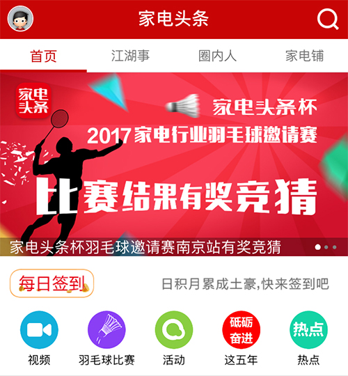 據(jù)了解,此次羽毛球邀請賽由“家電頭條”全程冠名。“家電頭條”APP是本次賽事承辦方中國家電網(wǎng)打造的一款家電資訊社區(qū)交互APP,集行業(yè)交流、資訊閱覽、話題發(fā)布與互動等功能于一體,致力于打造家電人自己的移動交互社區(qū)平臺,目前平臺中已經(jīng)有多家行業(yè)媒體和自媒體人加盟入駐。