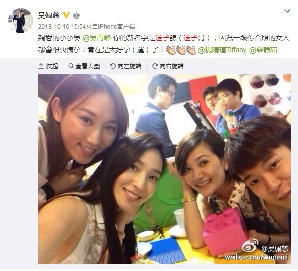 一開始,是吳佩慈和吳青峰合照后不久就懷了孕,然后就曬了自己和楊晴瑄、梁靜茹、吳青峰的合照,調(diào)侃說吳青峰是“送子哥”