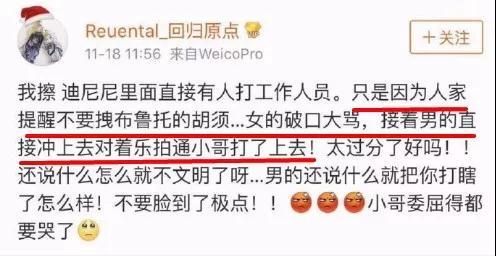 事情剛剛發(fā)生不久,“布魯托”又遭了秧。11月18日,微博網(wǎng)友@Reuental_回歸原點爆料有人在迪士尼里面辱罵、毆打工作人員,而辱罵毆打的原因竟是因為工作人員看見他們在拽“布魯托”的胡須之后,上前友情提示他們不要拽了,然而那對夫妻就一個開罵一個開打了!